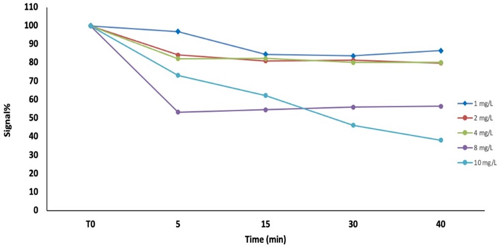 Figure 1. Biofilm Electrochemical Signal variation (%) after the exposure to different concentrations of fluoxetine (1, 2, 4, 8 and 10 mg/L) for 5, 15, 30 and 40 minutes.