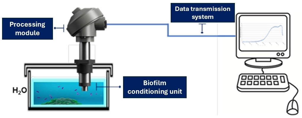 Figure 2. Main components of the biofilm-based biosensor: a biofilm conditioning unit, a signal transduction and processing module, and a data transmission system.