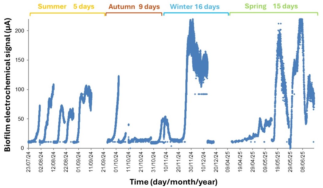 Figure 3. Representative electrochemical signal profile of biofilm development, highlighting seasonal-dependent variations during its formation. Specifically, biofilm develops after about 5, 9, 16 and 12 days in summer, autumn, winter, and spring, respectively. Each biofilm growth event was followed by cleaning of sensor and re-immersion.