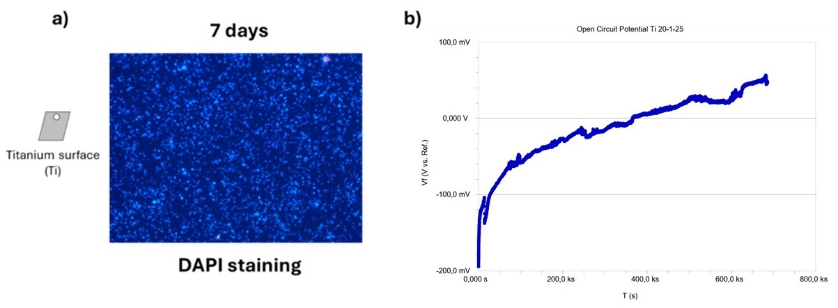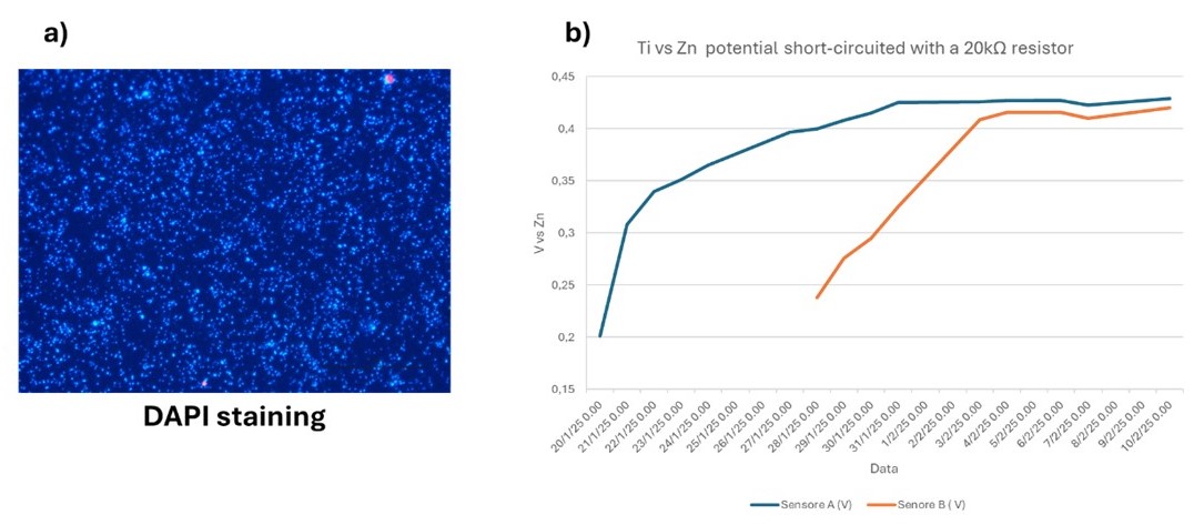 Figure 5. a) Biofilm colonization on titanium electrode revealed through DAPI staining; b) biofilm colonization on titanium electrode revealed through electrical potential monitoring.