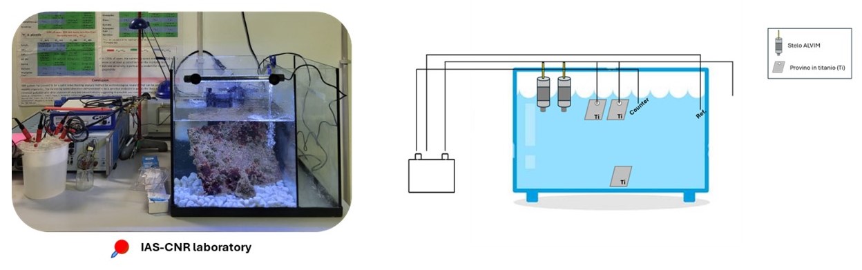 Previous experiments showed that each “stem”, once connected to the electronic unit, was colonized by an electrochemical active biofilm within 5 to 16 days, depending on the season. However, additional laboratory experiments were carried out using independent “stems”, not connected to the electronic unit, in order to determine whether and when biofilm coverage had reached maturity and exhibited bio electrochemical activity. The possibility of immersing multiple “stems”, interchangeable with the electronic unit, would allow for a constant availability of bio-electroactive biofilm for in-field marine monitoring, without the need to clean the sensor and wait one or two weeks for recolonization each time. Initial tests were conducted by immersing different “stems”, not connected to the electronic unit, under both semi-field and laboratory conditions, and monitoring the biofilm’s electrochemical activity after one week. Specifically, the semi-field experiments were carried out at the IAS-CNR Experimental Marine Station, as previously described, while the laboratory tests were performed in a 125 L marine mesocosm, maintained under optimal conditions for biofilm growth (T = 22 °C, pH = 8, salinity = 36.6 ‰). Surprisingly, no variation in the bio-electrochemical activity (µA) was detected on the ‘stem’, suggesting that the presence of an electronic unit connected to the ‘stems’ may be essential for the development of an electroactive biofilm. To further investigate this issue, additional laboratory experiments were carried out by immersing titanium electrodes in the mesocosm under free corrosion conditions, where the metal corrodes naturally without any external electrical influence, and the corrosion rate is determined solely by the electrochemical balance between oxidation and reduction reactions.
